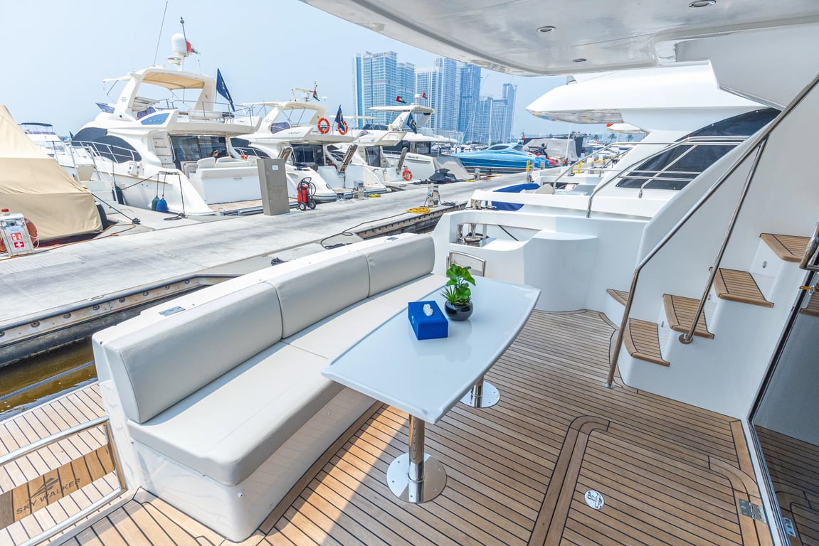 Luxusyacht Lee 52 mit einer Kapazität für 15 Passagiere. Das Hotel liegt am Hafen von Dubai. Erbaut im Jahr 2024. 1 schlafzimmer, 2 Betten.