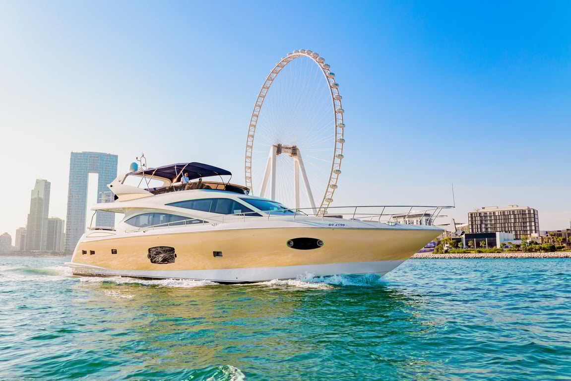 Luxury yacht Astra 76 with capacity for 45 passengers. Located at Dubai Harbour. Built in 2022. 2 bedrooms, 6 beds.