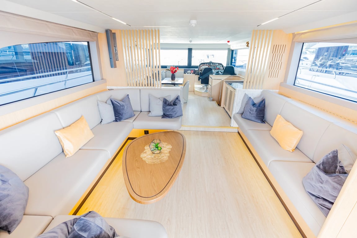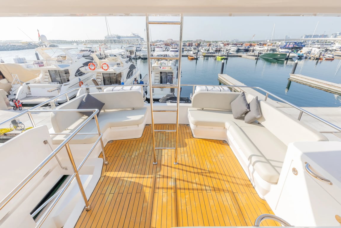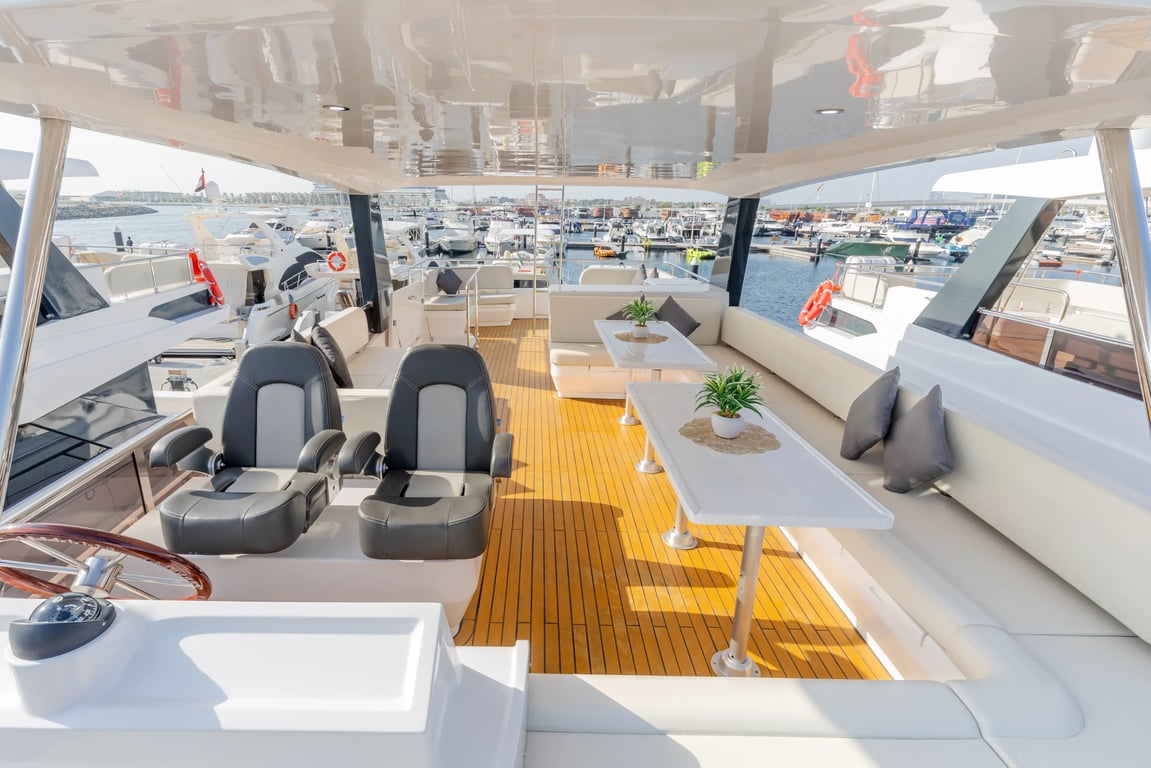Luxury yacht Fibo 62 with capacity for 25 passengers. Located at Dubai Harbour. Built in 2024. 3 bedrooms, 6 beds.