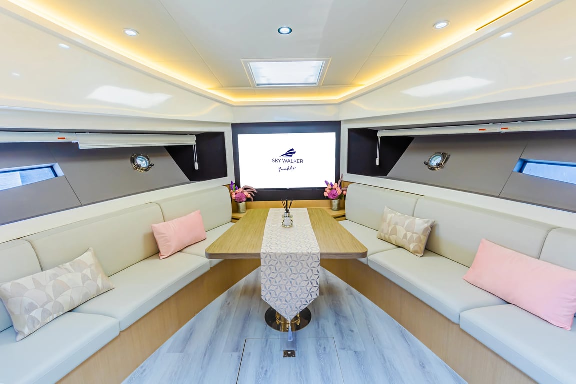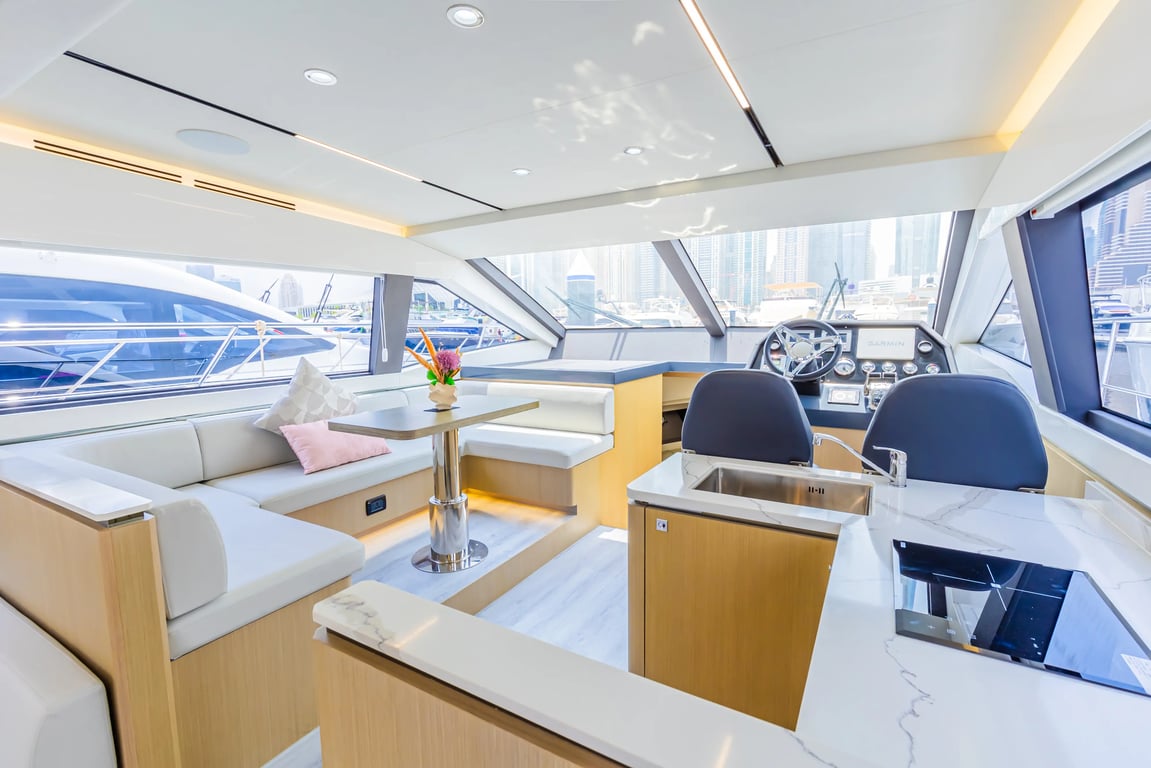 Luxury yacht Fin 52 with capacity for 15 passengers. Located at Dubai Harbour. Built in 2024. 1 bedrooms, 2 beds.