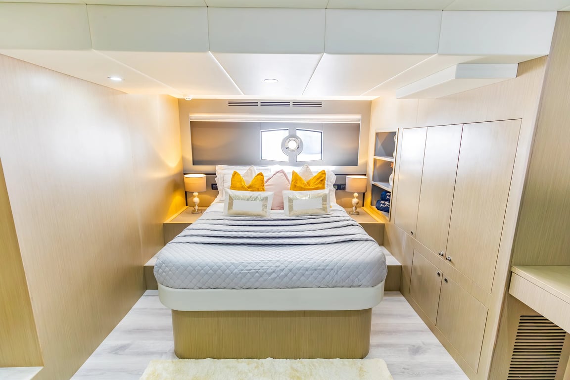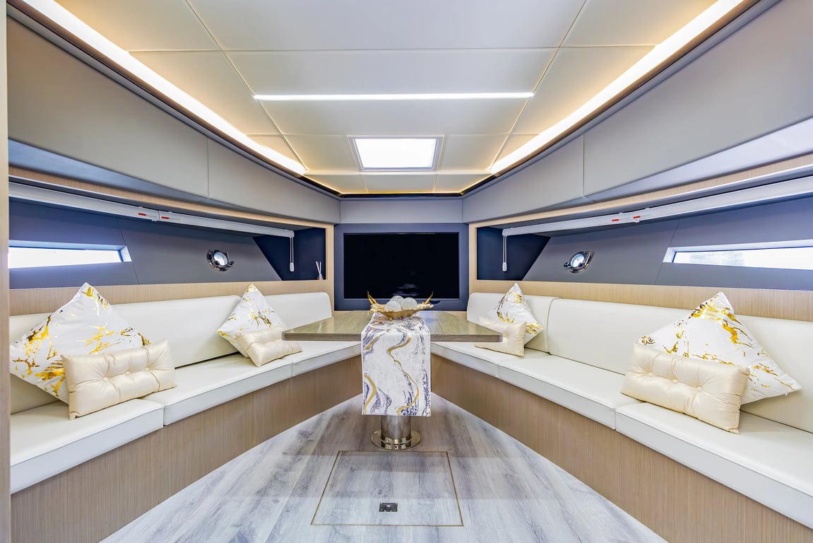Luxury yacht Kio 52 with capacity for 15 passengers. Located at Dubai Harbour. Built in 2023. 2 bedrooms, 2 beds.