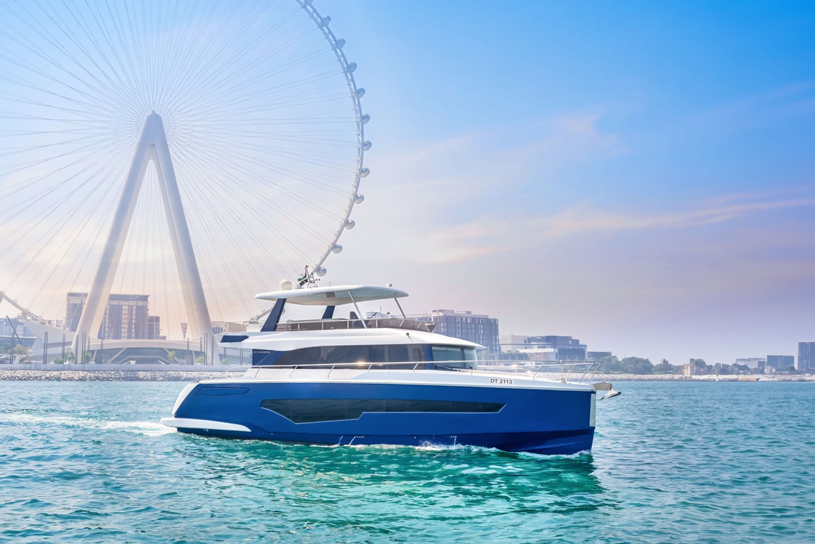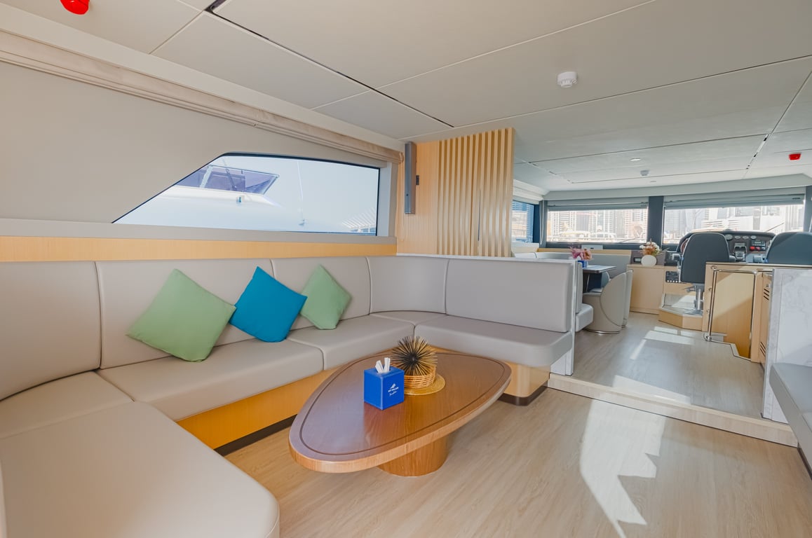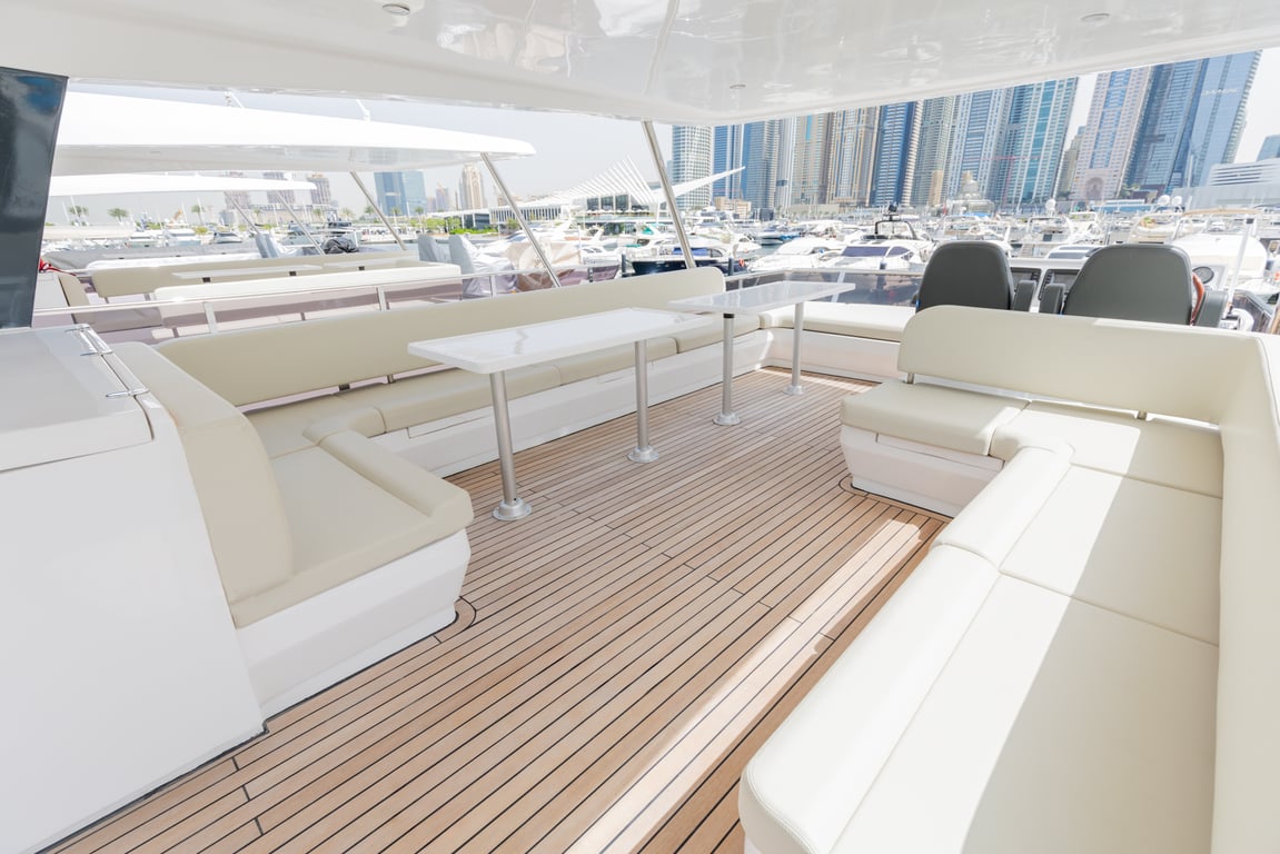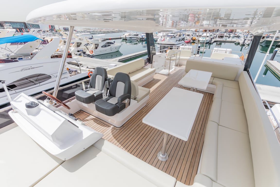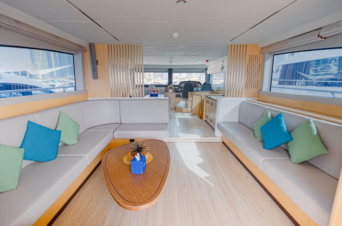 Luxury yacht Taka 62 with capacity for 25 passengers. Located at Dubai Harbour. Built in 2023. 3 bedrooms, 6 beds.