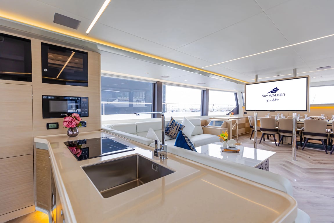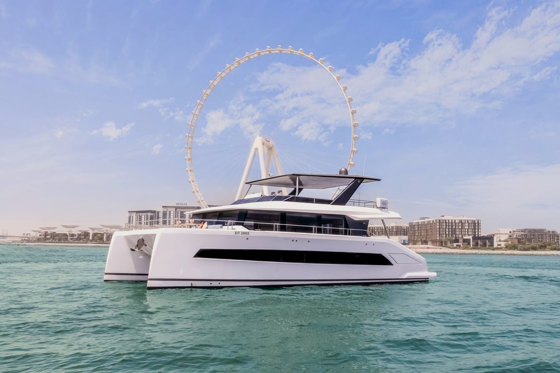 Luxury yacht Volare 60 with capacity for 45 passengers. Located at Dubai Harbour. Built in 2024. 2 bedrooms, 6 beds.